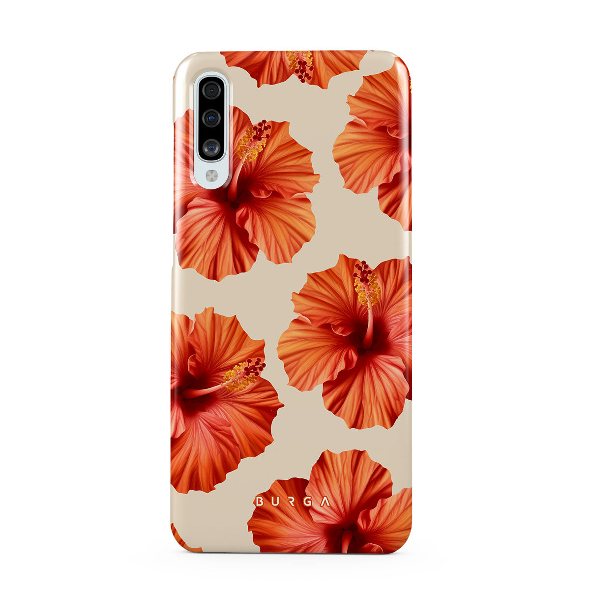 Transport yourself to a lush tropical escape with Bonita. Featuring bold, beautiful hibiscus blooms that pop against a creamy backdrop, this Samsung Galaxy A50 phone case design is perfect for those who dream of vibrant, floral beauty and exotic adventures.