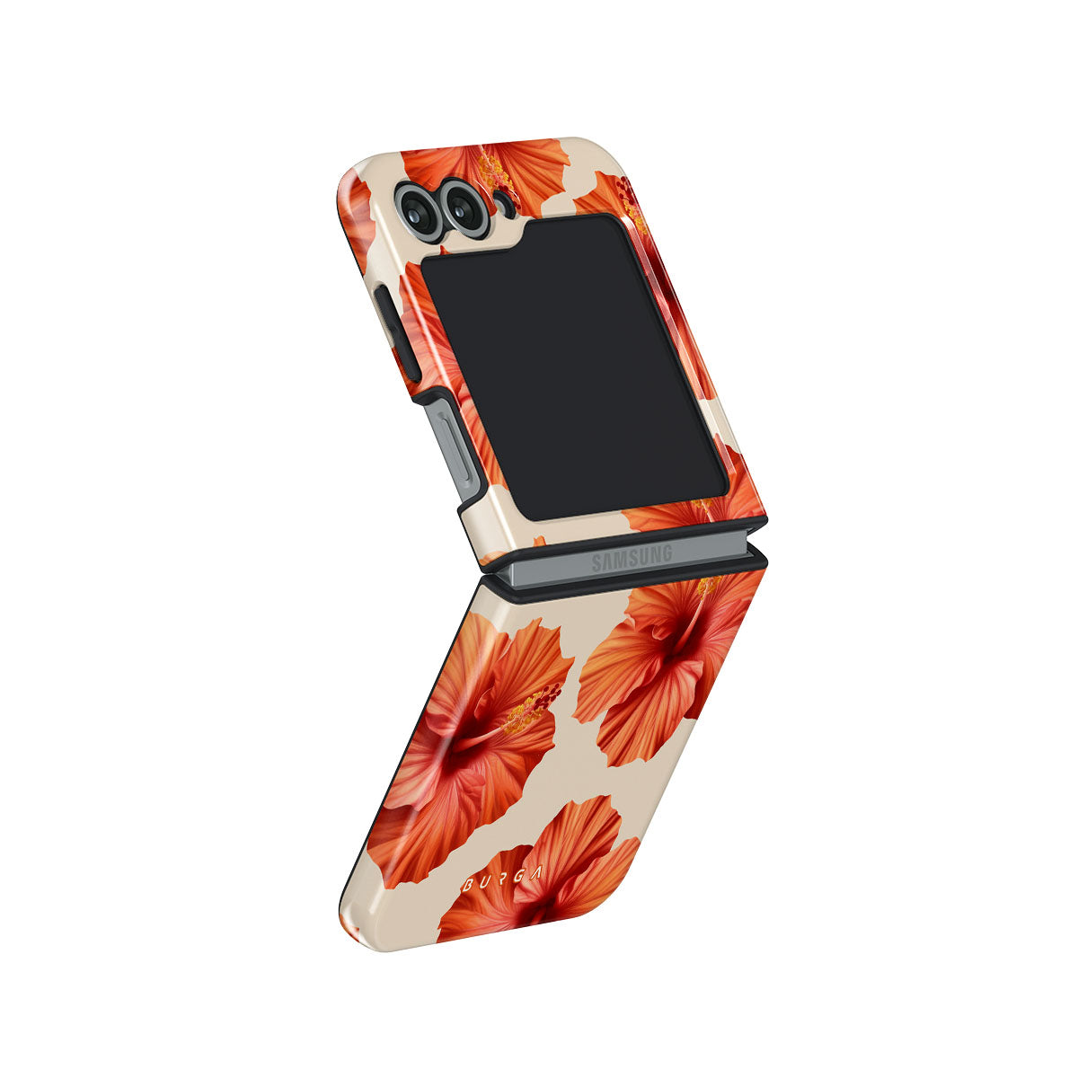 Transport yourself to a lush tropical escape with Bonita. Featuring bold, beautiful hibiscus blooms that pop against a creamy backdrop, this Samsung Galaxy Z Flip 6 phone case design is perfect for those who dream of vibrant, floral beauty and exotic adventures.