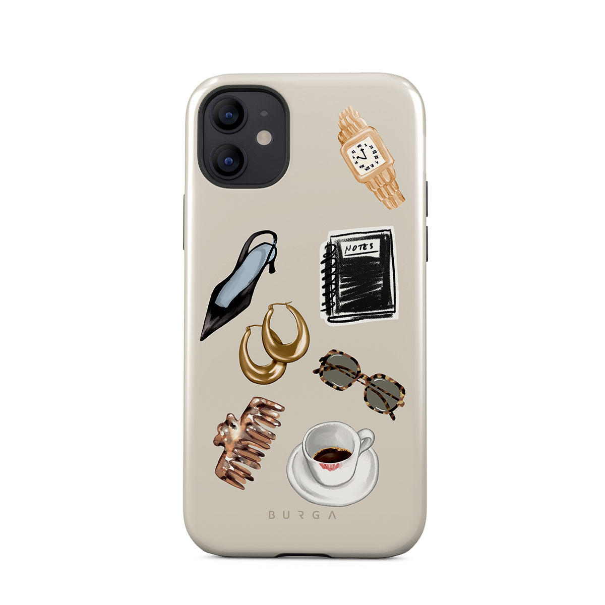 This design features: black high heel, gold hoop earrings, black notebook, coffee cup, tortoiseshell glasses, brown scrunchie, retro gold watch