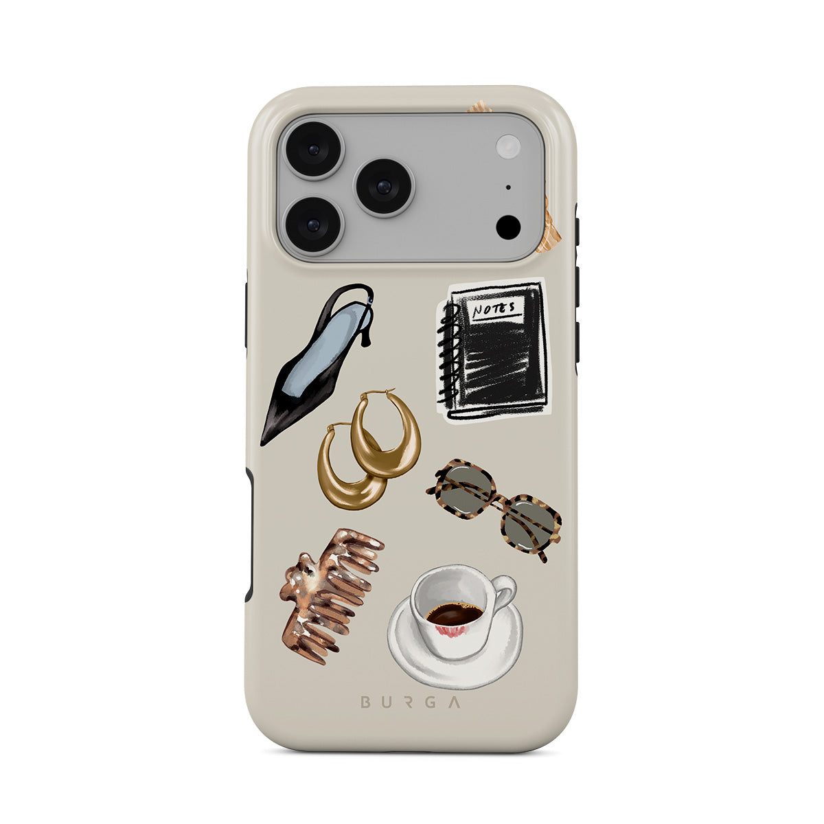 This design features: black high heel, gold hoop earrings, black notebook, coffee cup, tortoiseshell glasses, brown scrunchie, retro gold watch