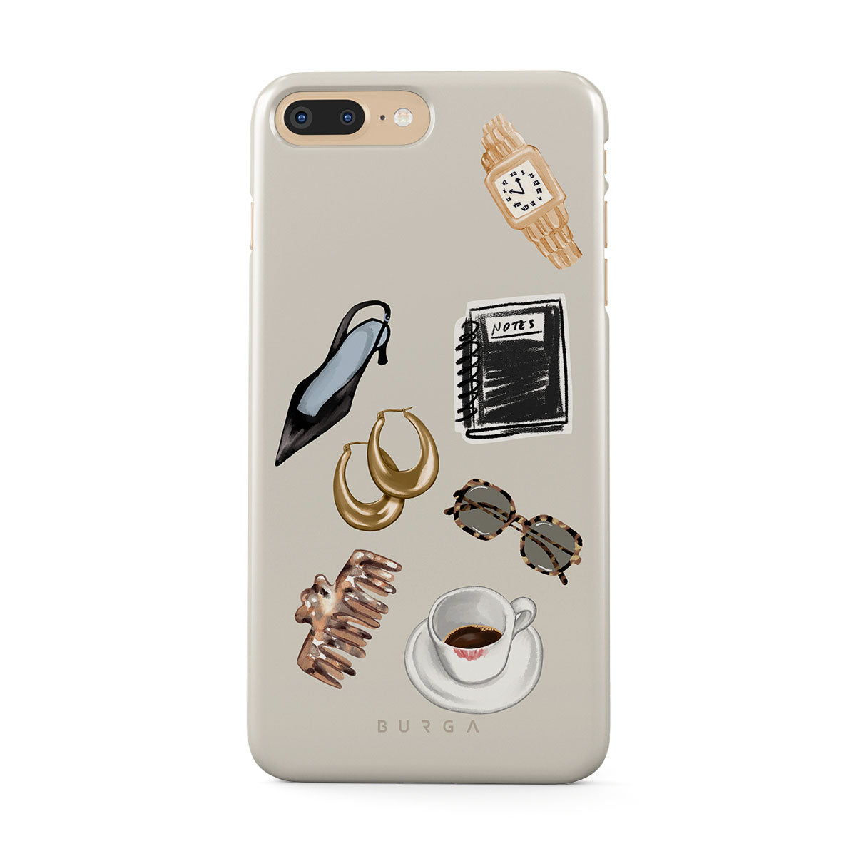 This design features: black high heel, gold hoop earrings, black notebook, coffee cup, tortoiseshell glasses, brown scrunchie, retro gold watch