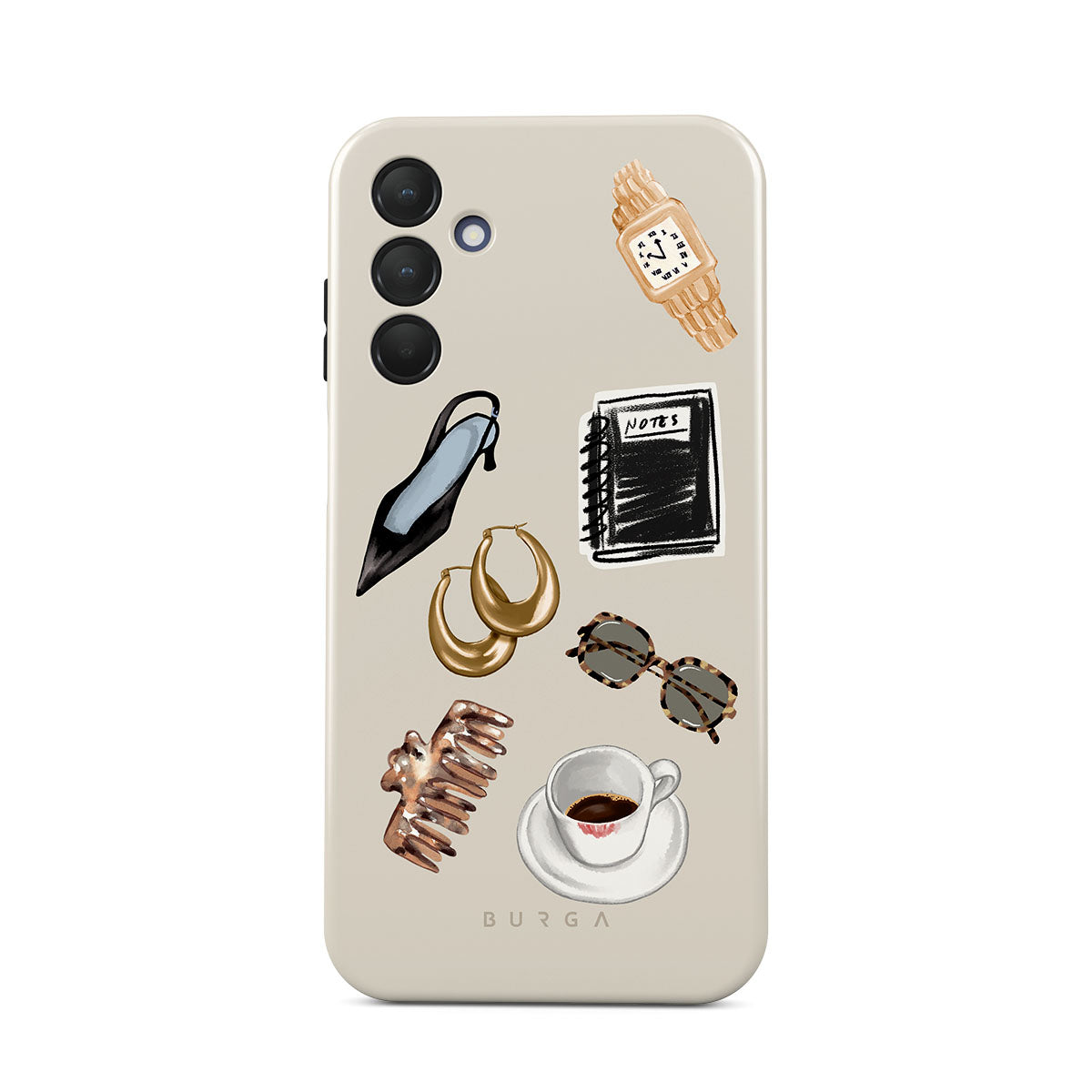 This design features: black high heel, gold hoop earrings, black notebook, coffee cup, tortoiseshell glasses, brown scrunchie, retro gold watch