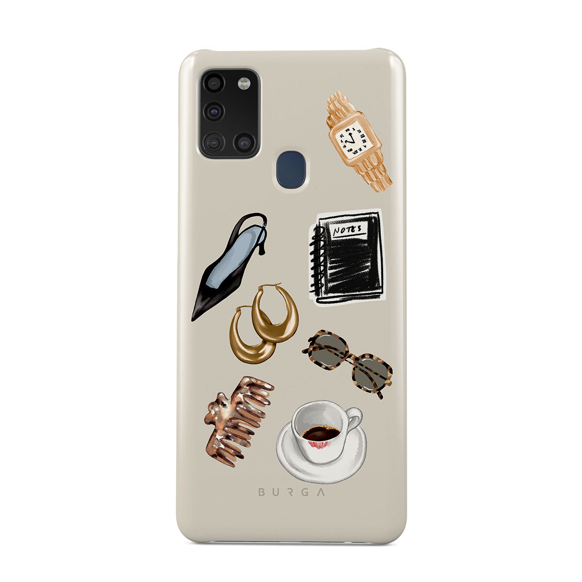 This design features: black high heel, gold hoop earrings, black notebook, coffee cup, tortoiseshell glasses, brown scrunchie, retro gold watch