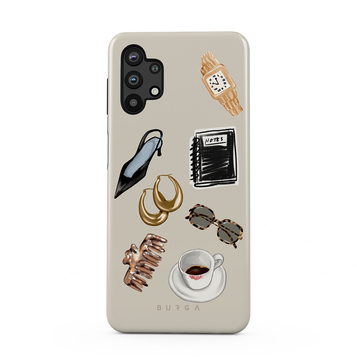 This design features: black high heel, gold hoop earrings, black notebook, coffee cup, tortoiseshell glasses, brown scrunchie, retro gold watch