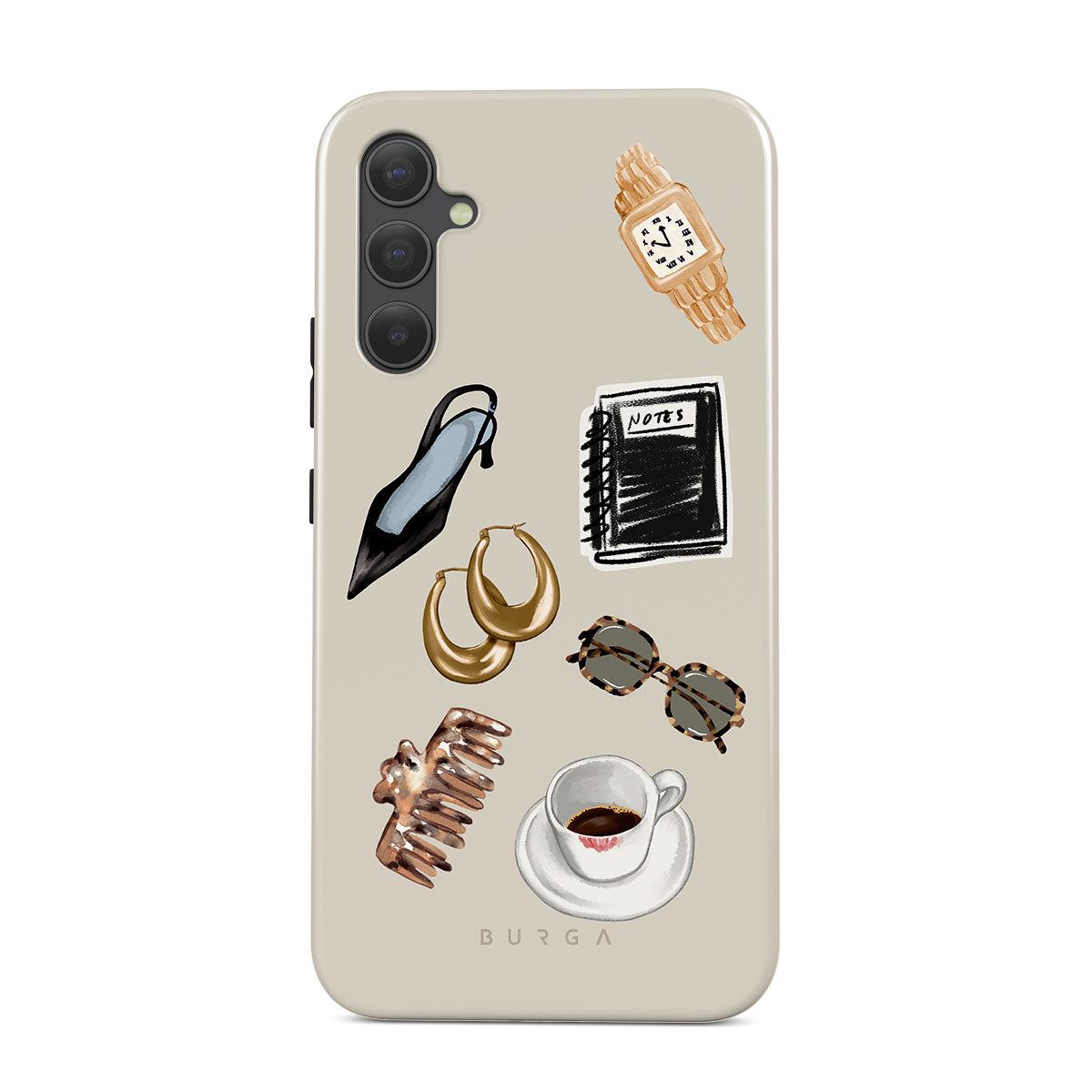 This design features: black high heel, gold hoop earrings, black notebook, coffee cup, tortoiseshell glasses, brown scrunchie, retro gold watch