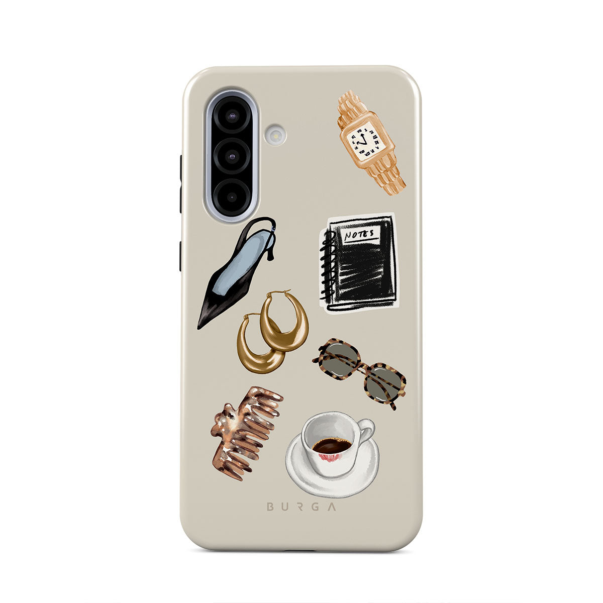 This design features: black high heel, gold hoop earrings, black notebook, coffee cup, tortoiseshell glasses, brown scrunchie, retro gold watch
