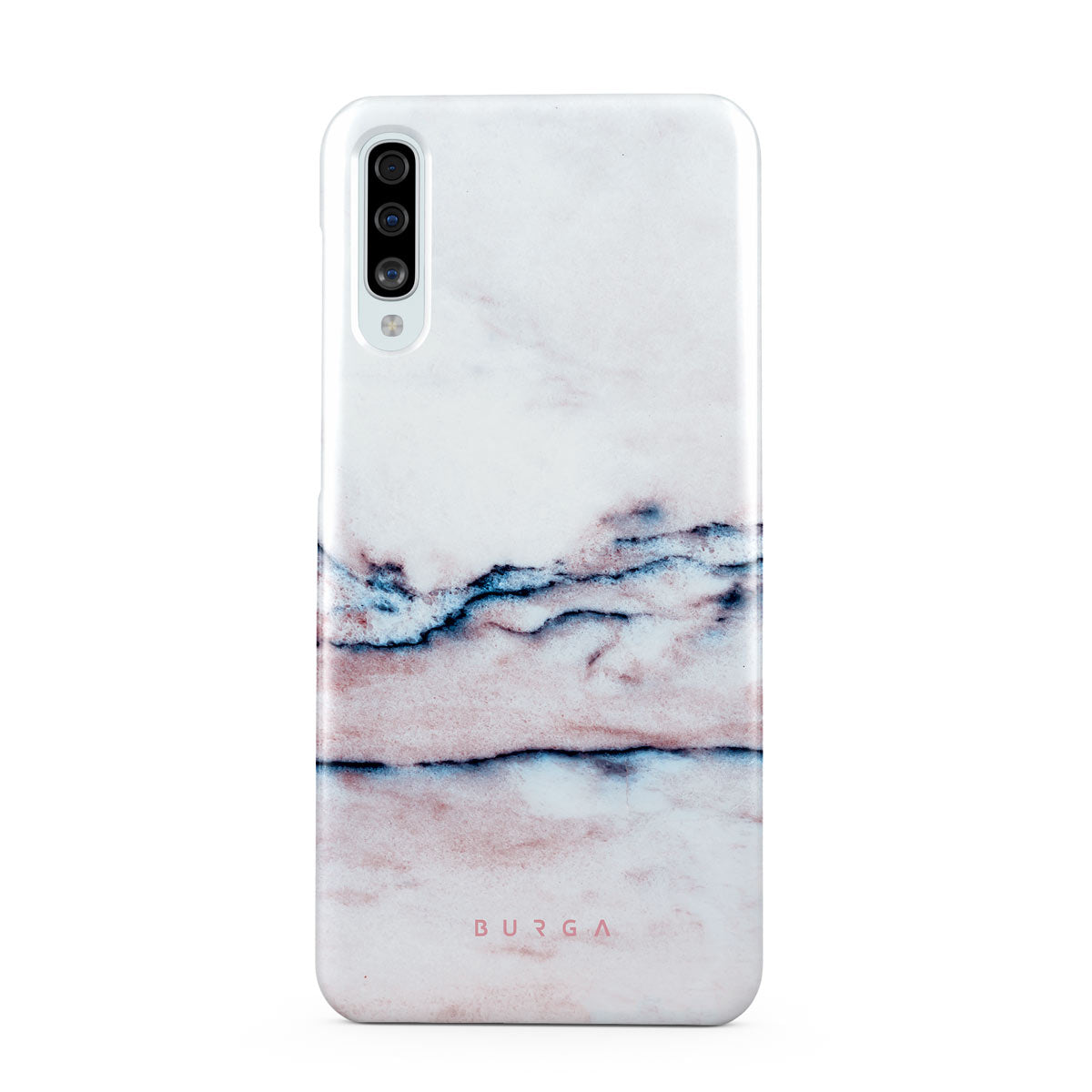 A pastel phone case is a must in every collection, and our soft Bubble Gum Samsung Galaxy A50 phone case is the one. The minimalistic design features a pink gradient with deep blue swirls in a marble pattern. Such a hard-shell case will provide heavy-duty protection while adding a touch of pastel to your collection