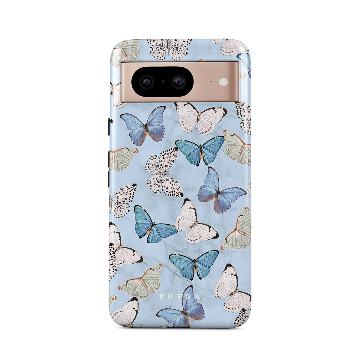 Pastel blue and a playful pattern of summery butterflies create a dreamy combination in our Google Pixel 8 phone case. Carry the feeling of the butterflies in your stomach while protecting your phone from any dangers, as the hard-shell case will keep it sound and safe.