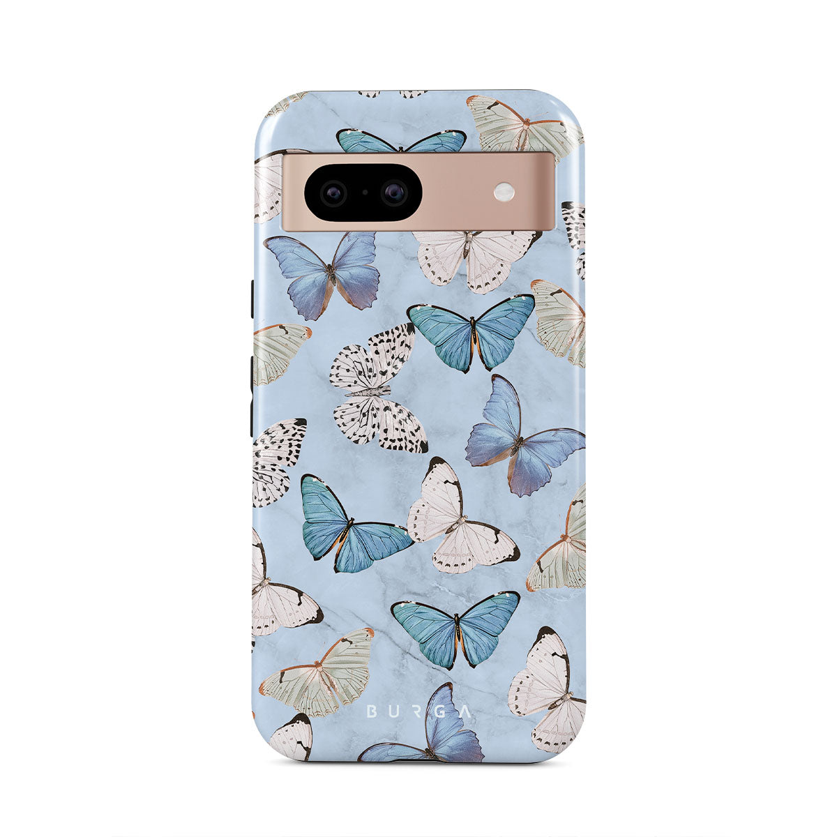 Pastel blue and a playful pattern of summery butterflies create a dreamy combination in our Google Pixel 8a phone case. Carry the feeling of the butterflies in your stomach while protecting your phone from any dangers, as the hard-shell case will keep it sound and safe.
