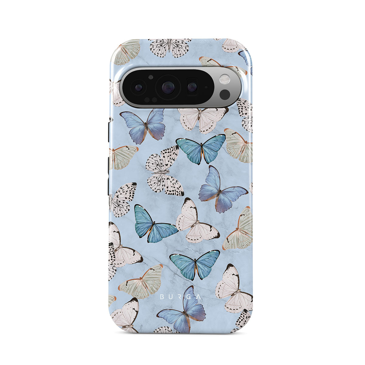 Pastel blue and a playful pattern of summery butterflies create a dreamy combination in our Google Pixel 9 Pro XL phone case. Carry the feeling of the butterflies in your stomach while protecting your phone from any dangers, as the hard-shell case will keep it sound and safe.