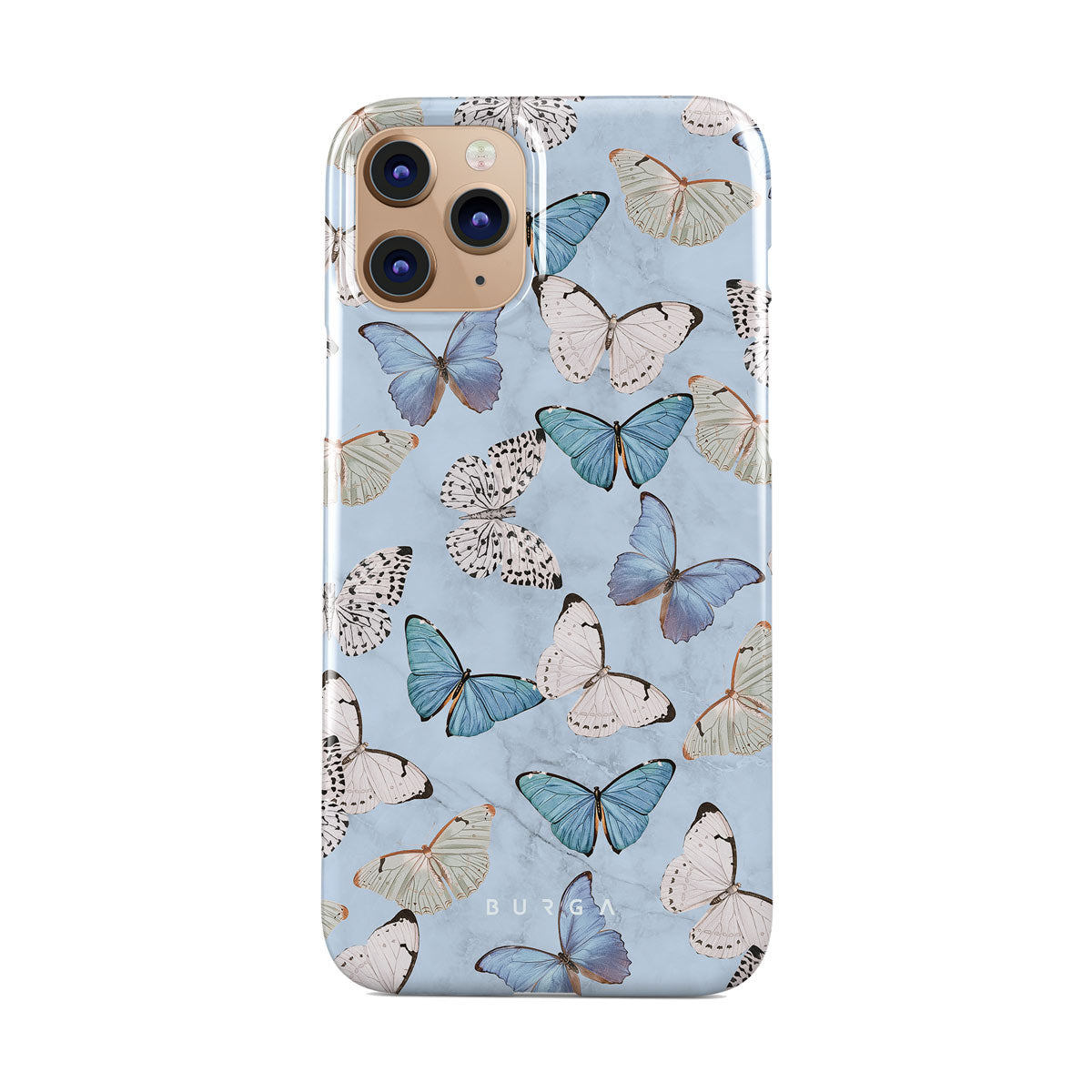 Pastel blue and a playful pattern of summery butterflies create a dreamy combination in our iPhone 11 Pro phone case. Carry the feeling of the butterflies in your stomach while protecting your phone from any dangers, as the hard-shell case will keep it sound and safe.