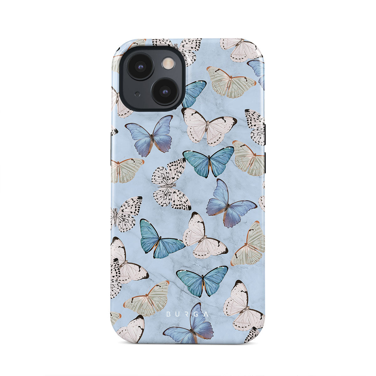 Pastel blue and a playful pattern of summery butterflies create a dreamy combination in our iPhone 15 phone case. Carry the feeling of the butterflies in your stomach while protecting your phone from any dangers, as the hard-shell case will keep it sound and safe.