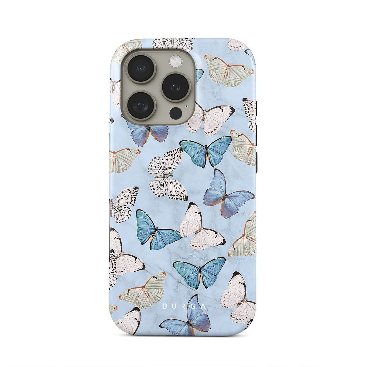 Pastel blue and a playful pattern of summery butterflies create a dreamy combination in our iPhone 16 Pro phone case. Carry the feeling of the butterflies in your stomach while protecting your phone from any dangers, as the hard-shell case will keep it sound and safe.