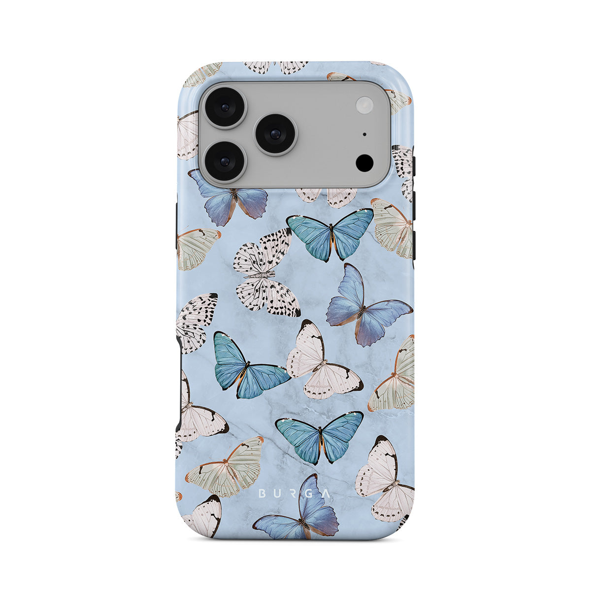 Pastel blue and a playful pattern of summery butterflies create a dreamy combination in our iPhone 17 Pro Max phone case. Carry the feeling of the butterflies in your stomach while protecting your phone from any dangers, as the hard-shell case will keep it sound and safe.