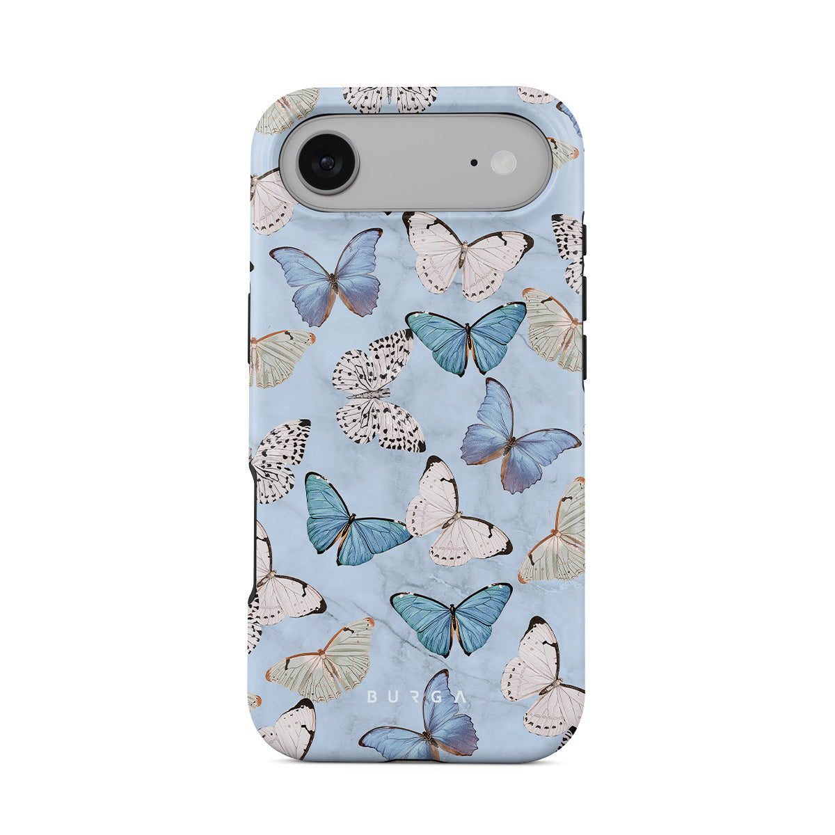 Pastel blue and a playful pattern of summery butterflies create a dreamy combination in our iPhone Air phone case. Carry the feeling of the butterflies in your stomach while protecting your phone from any dangers, as the hard-shell case will keep it sound and safe.