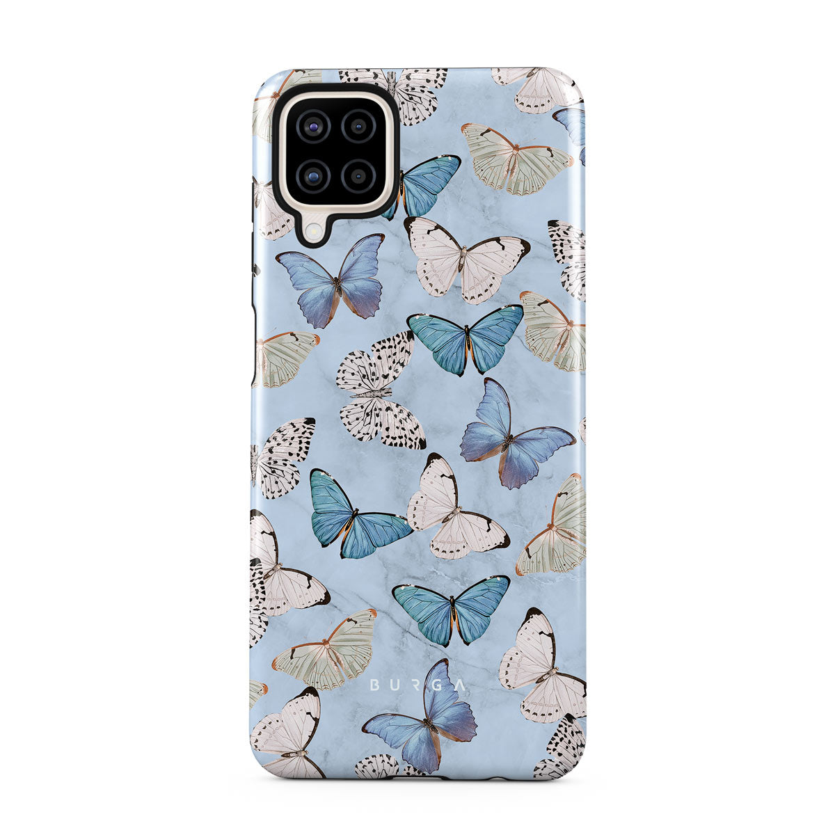 Pastel blue and a playful pattern of summery butterflies create a dreamy combination in our Samsung Galaxy A12 4G phone case. Carry the feeling of the butterflies in your stomach while protecting your phone from any dangers, as the hard-shell case will keep it sound and safe.
