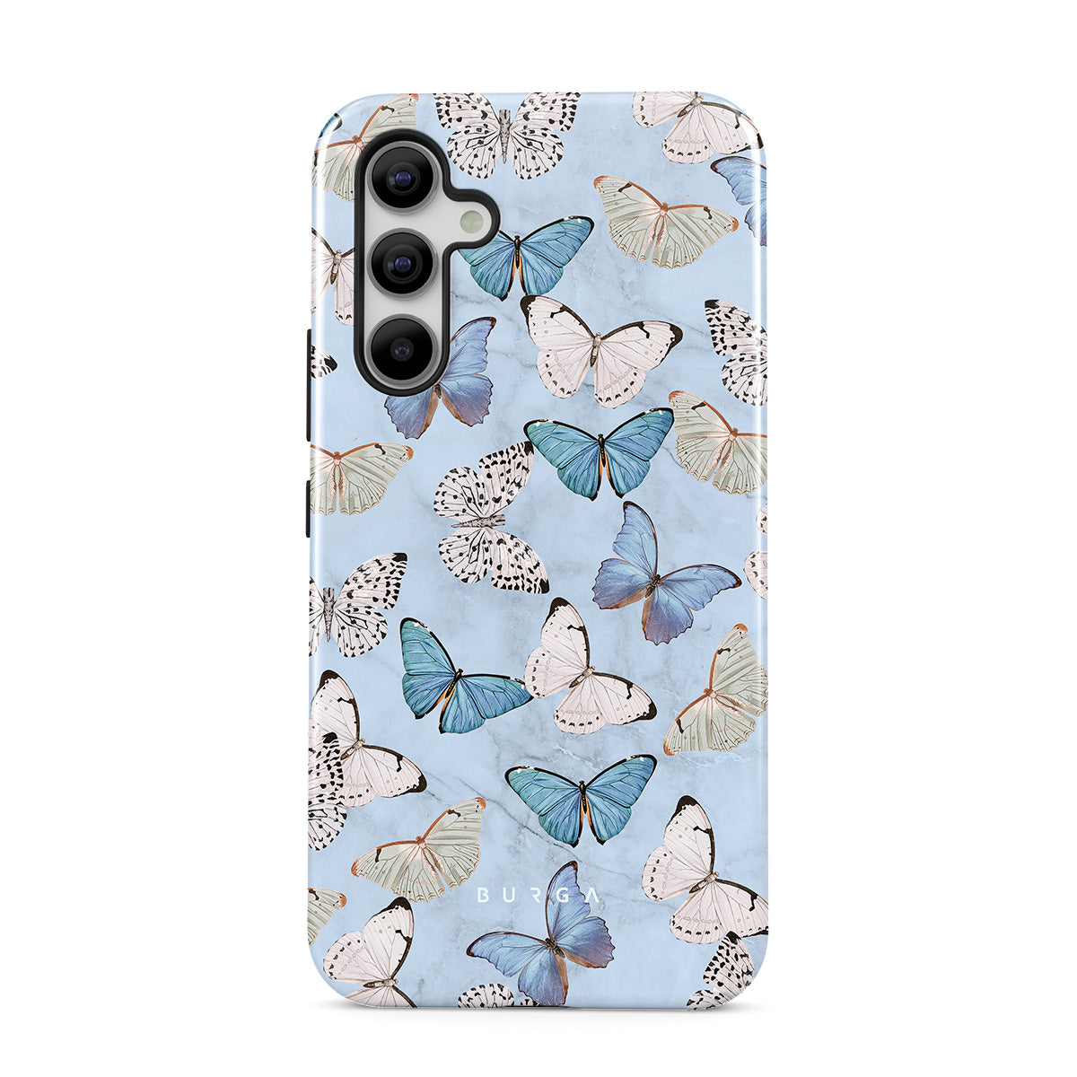 Pastel blue and a playful pattern of summery butterflies create a dreamy combination in our Samsung Galaxy A55 phone case. Carry the feeling of the butterflies in your stomach while protecting your phone from any dangers, as the hard-shell case will keep it sound and safe.