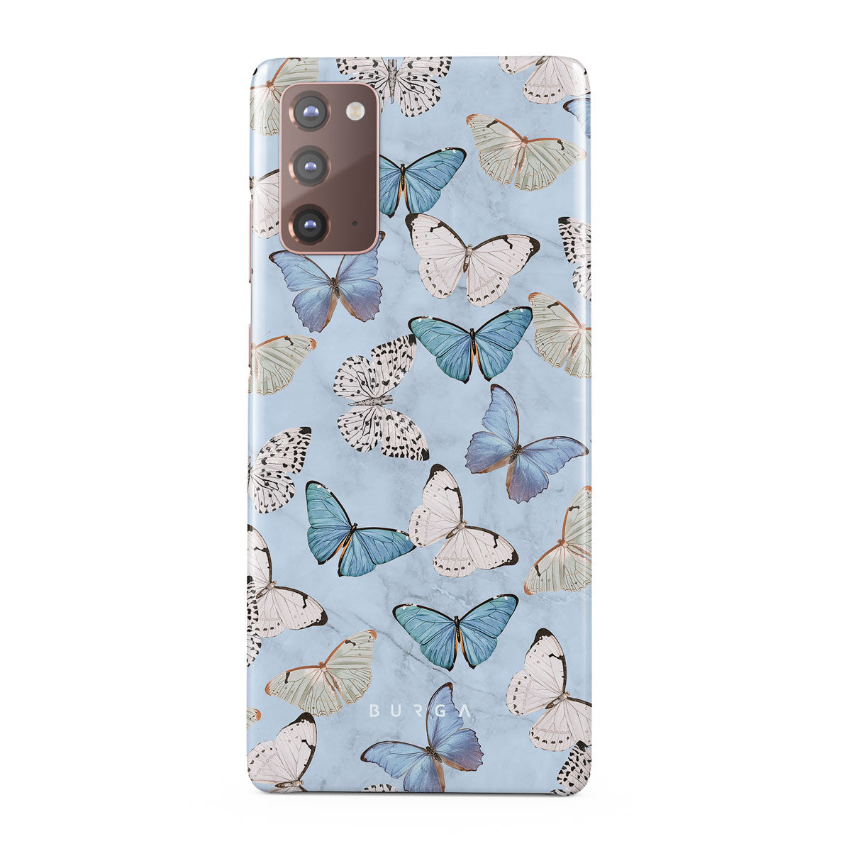 Pastel blue and a playful pattern of summery butterflies create a dreamy combination in our Samsung Galaxy Note 20 4G / 5G phone case. Carry the feeling of the butterflies in your stomach while protecting your phone from any dangers, as the hard-shell case will keep it sound and safe.