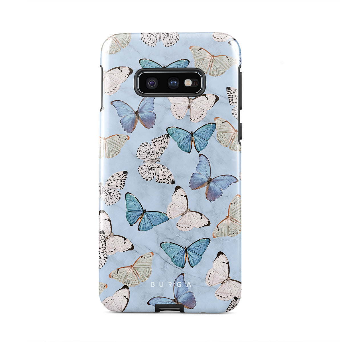Pastel blue and a playful pattern of summery butterflies create a dreamy combination in our Samsung Galaxy S10E phone case. Carry the feeling of the butterflies in your stomach while protecting your phone from any dangers, as the hard-shell case will keep it sound and safe.
