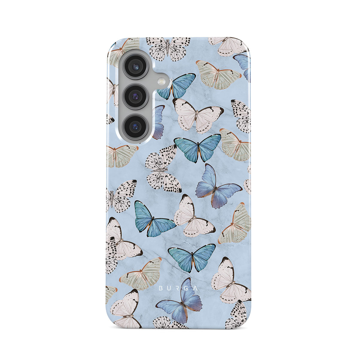 Pastel blue and a playful pattern of summery butterflies create a dreamy combination in our Samsung Galaxy S24 Plus phone case. Carry the feeling of the butterflies in your stomach while protecting your phone from any dangers, as the hard-shell case will keep it sound and safe.