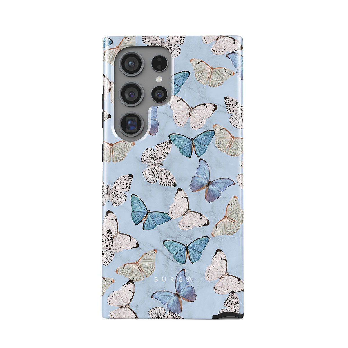 Pastel blue and a playful pattern of summery butterflies create a dreamy combination in our Samsung Galaxy S24 Ultra phone case. Carry the feeling of the butterflies in your stomach while protecting your phone from any dangers, as the hard-shell case will keep it sound and safe.