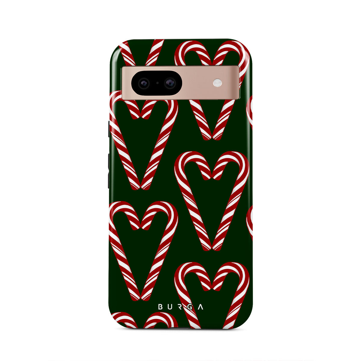 Vibrant and playful, our Candy Cane Google Pixel 8a Case phone case design showcases candy cane heart motifs against a dark green background—a delightful choice for those who love a touch of whimsy and nostalgia.