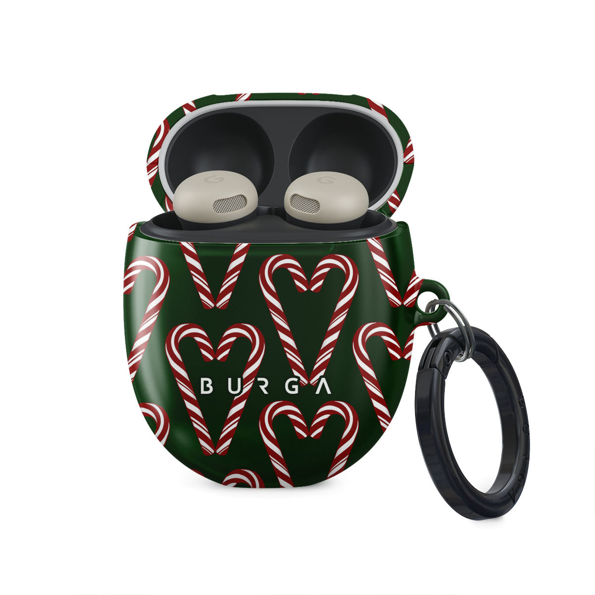 Vibrant and playful, our Candy Cane Google Pixel Buds Pro 2 Case cover design showcases candy cane heart motifs against a dark green background—a delightful choice for those who love a touch of whimsy and nostalgia.