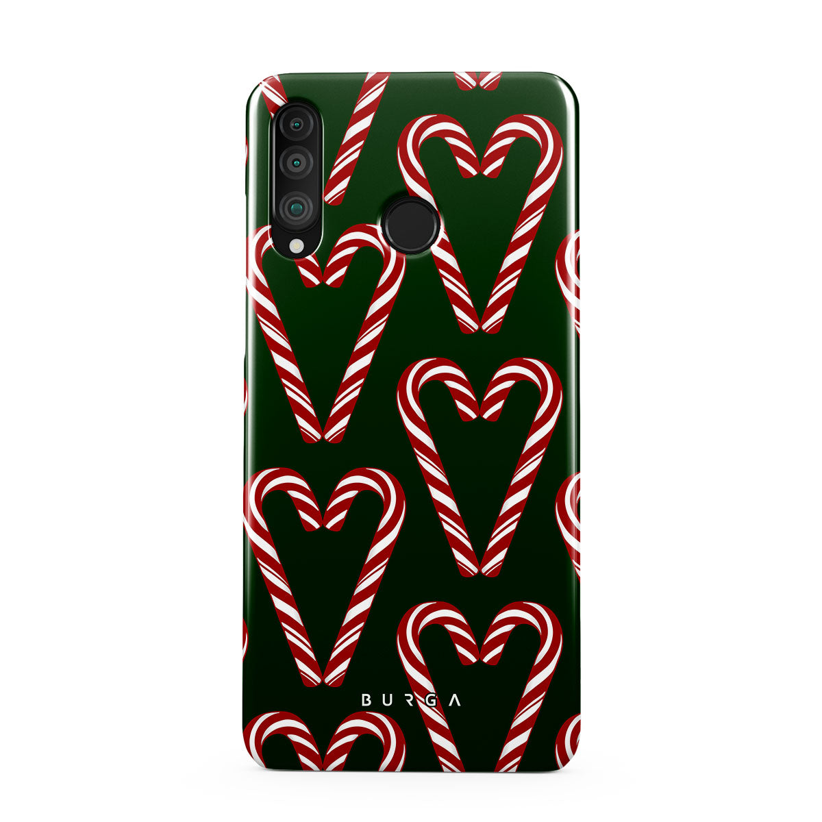 Vibrant and playful, our Candy Cane Huawei P30 Lite Case phone case design showcases candy cane heart motifs against a dark green background—a delightful choice for those who love a touch of whimsy and nostalgia.