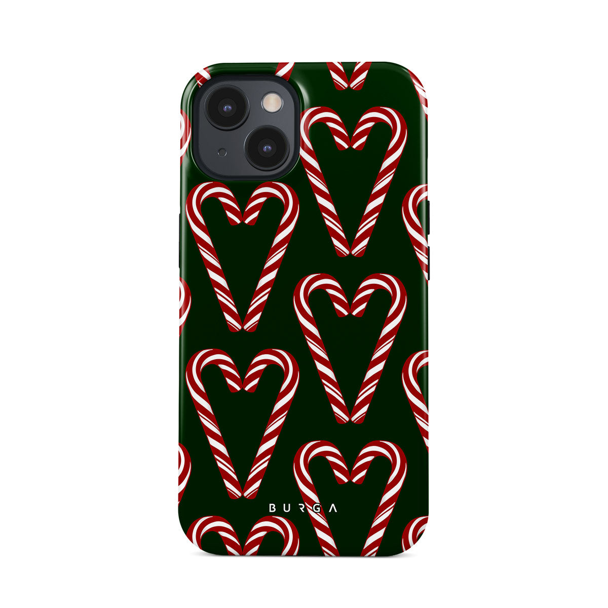 Vibrant and playful, our Candy Cane iPhone 14 Plus Case phone case design showcases candy cane heart motifs against a dark green background—a delightful choice for those who love a touch of whimsy and nostalgia.