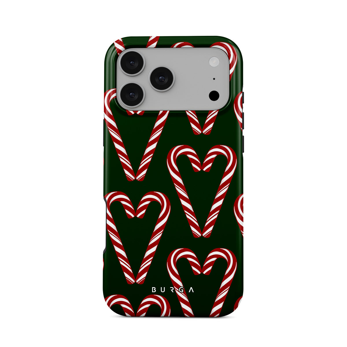 Vibrant and playful, our Candy Cane iPhone 17 Pro Max Case phone case design showcases candy cane heart motifs against a dark green background—a delightful choice for those who love a touch of whimsy and nostalgia.