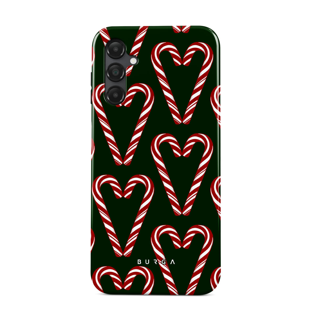 Vibrant and playful, our Candy Cane Samsung Galaxy A14 5G Case phone case design showcases candy cane heart motifs against a dark green background—a delightful choice for those who love a touch of whimsy and nostalgia.