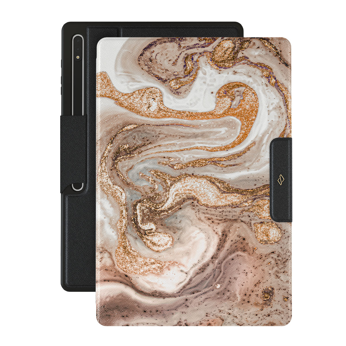 Our enchanting Cappuccino Samsung Galaxy Tab S8 Ultra folio case showcases a sophisticated and creamy marble pattern with golden swirls in it. The marble dream radiates elegance and luxury and is guaranteed to add some to your style.