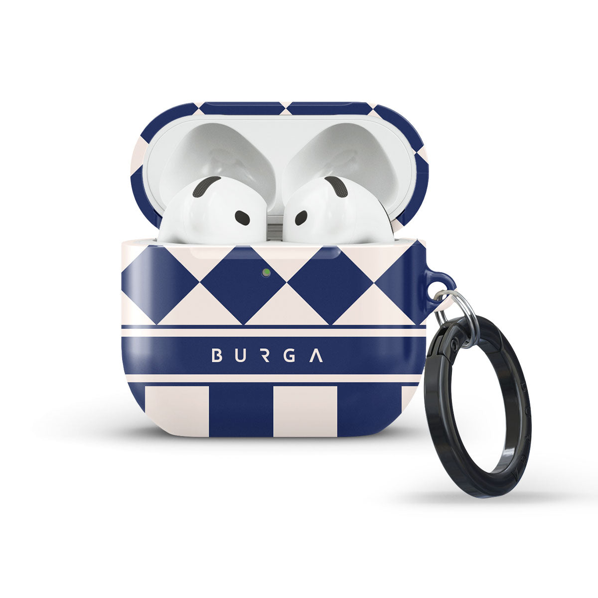Embrace the essence of subtle luxury with our Check & Mate Apple AirPods 4 case cover design. Blending eggshell and deep blue checkers, it evokes whispers of elegance. While diamonds grace the upper half, the lower half features a timeless chessboard pattern.