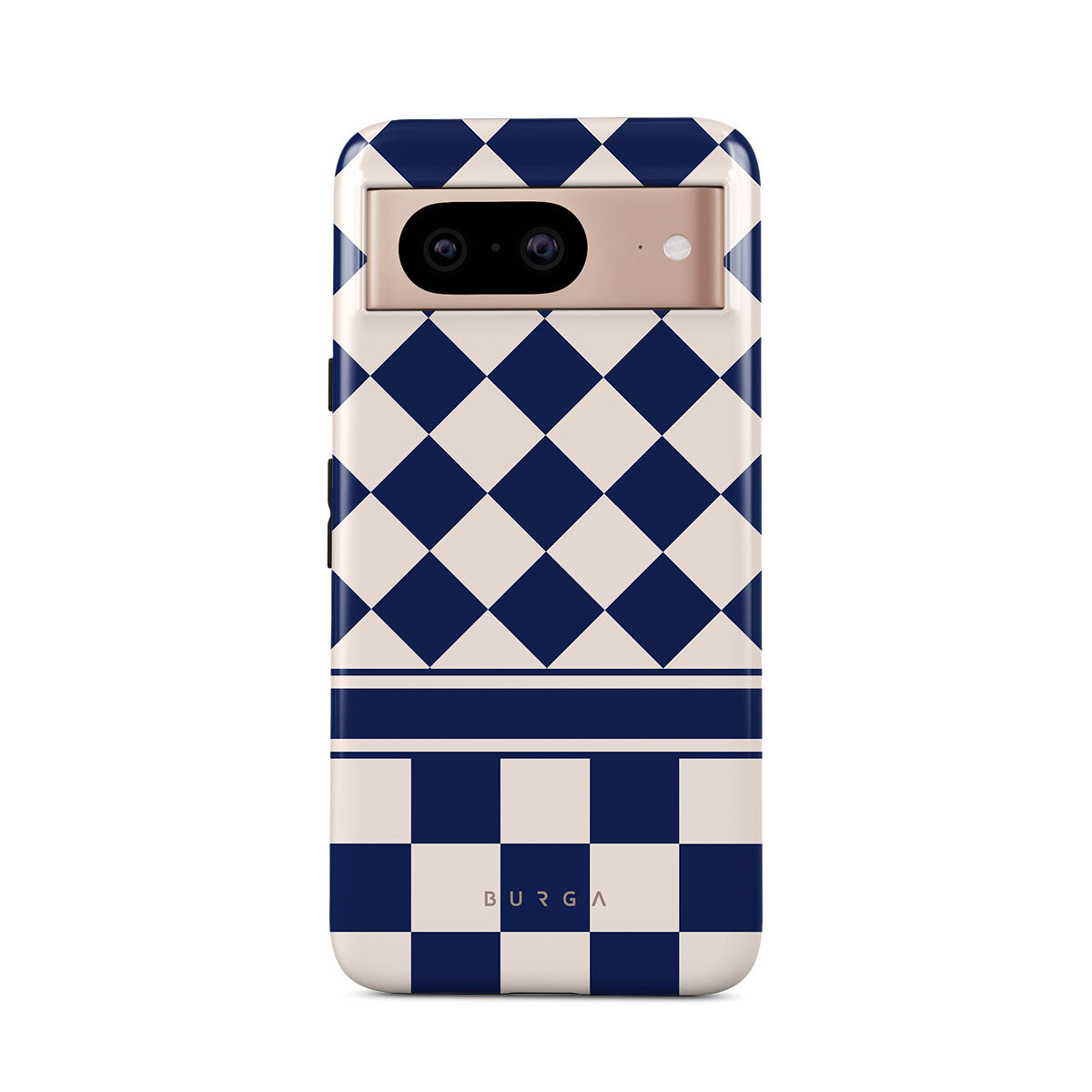 Embrace the essence of subtle luxury with our Check & Mate Google Pixel 8 phone case design. Blending eggshell and deep blue checkers, it evokes whispers of elegance. While diamonds grace the upper half, the lower half features a timeless chessboard pattern.