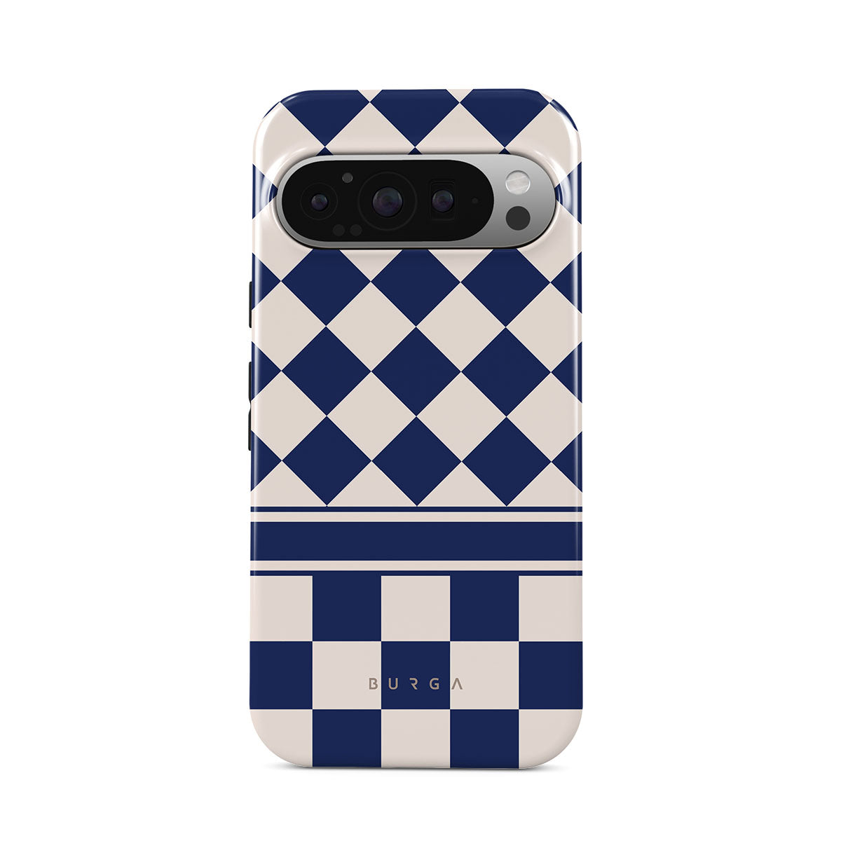Embrace the essence of subtle luxury with our Check & Mate Google Pixel 9 Pro XL phone case design. Blending eggshell and deep blue checkers, it evokes whispers of elegance. While diamonds grace the upper half, the lower half features a timeless chessboard pattern.
