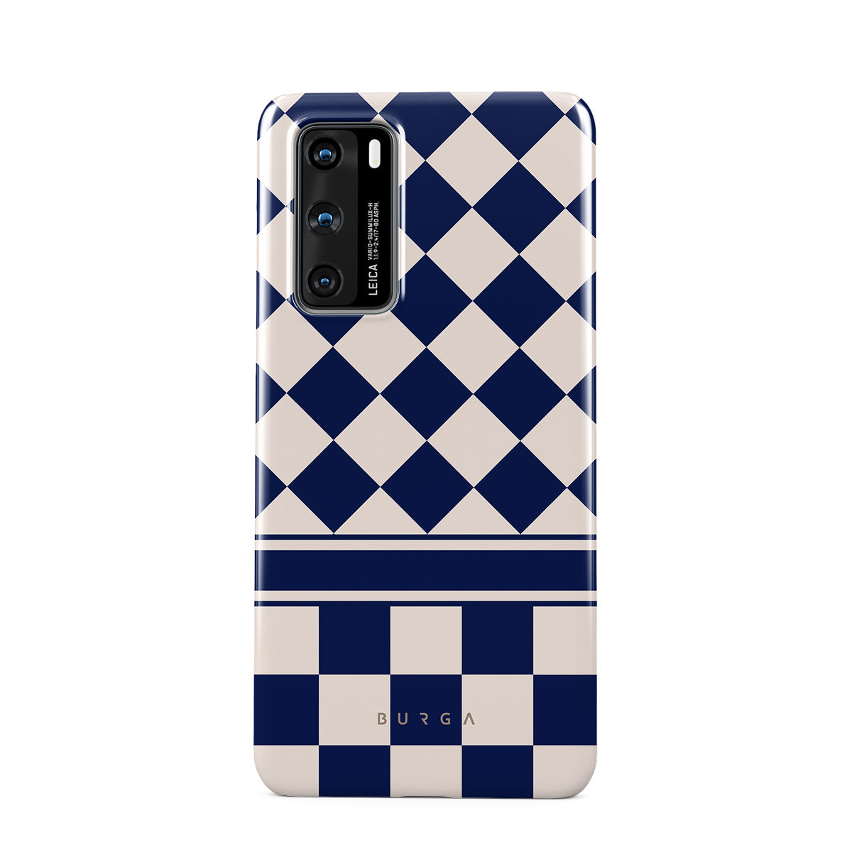 Embrace the essence of subtle luxury with our Check & Mate Huawei P40 phone case design. Blending eggshell and deep blue checkers, it evokes whispers of elegance. While diamonds grace the upper half, the lower half features a timeless chessboard pattern.