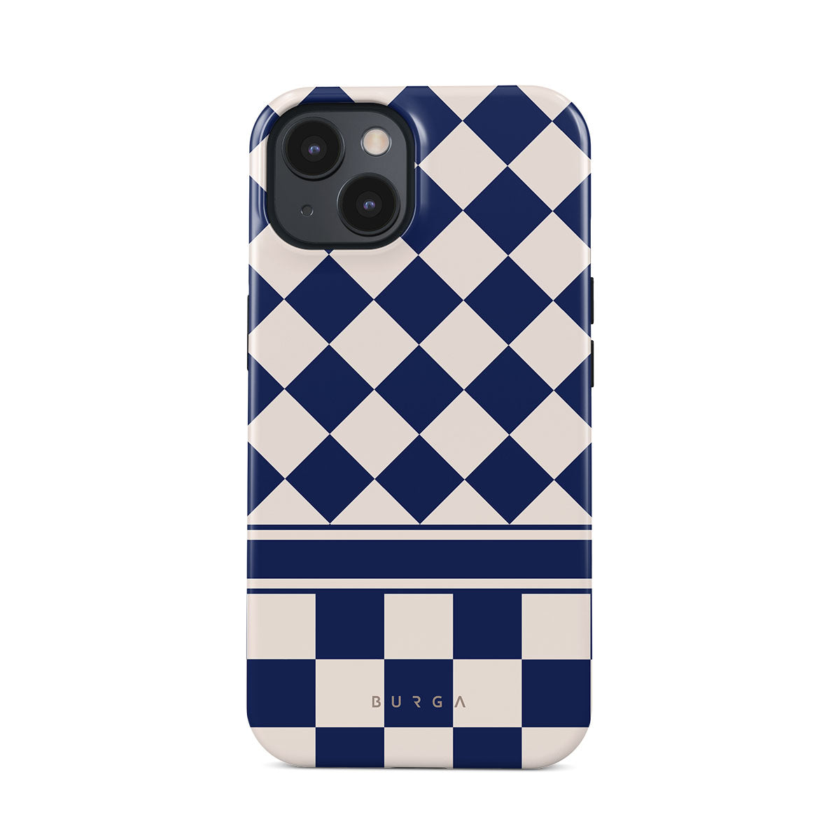 Embrace the essence of subtle luxury with our Check & Mate iPhone 14 phone case design. Blending eggshell and deep blue checkers, it evokes whispers of elegance. While diamonds grace the upper half, the lower half features a timeless chessboard pattern.