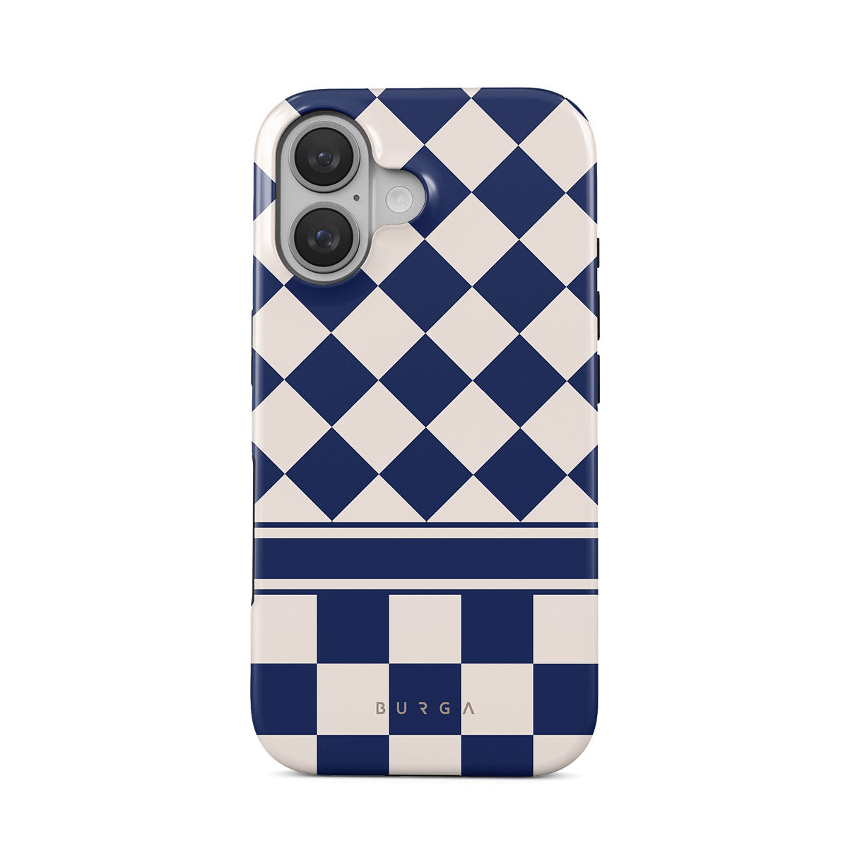 Embrace the essence of subtle luxury with our Check & Mate iPhone 16 phone case design. Blending eggshell and deep blue checkers, it evokes whispers of elegance. While diamonds grace the upper half, the lower half features a timeless chessboard pattern.