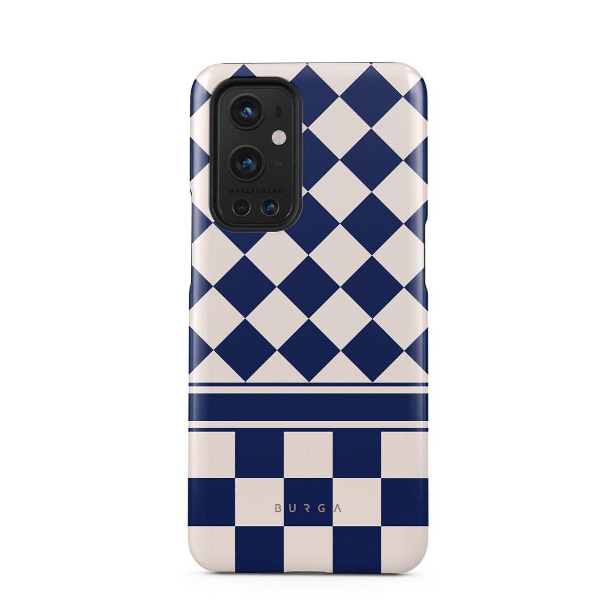 Embrace the essence of subtle luxury with our Check & Mate OnePlus 9 phone case design. Blending eggshell and deep blue checkers, it evokes whispers of elegance. While diamonds grace the upper half, the lower half features a timeless chessboard pattern.