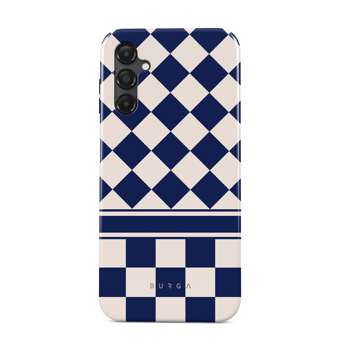 Embrace the essence of subtle luxury with our Check & Mate Samsung Galaxy A25 phone case design. Blending eggshell and deep blue checkers, it evokes whispers of elegance. While diamonds grace the upper half, the lower half features a timeless chessboard pattern.