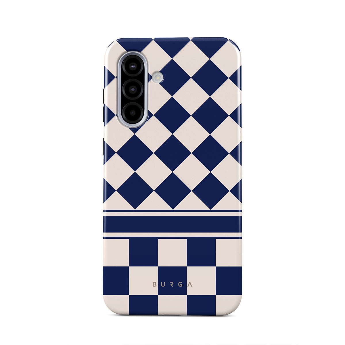 Embrace the essence of subtle luxury with our Check & Mate Samsung Galaxy A56 5G phone case design. Blending eggshell and deep blue checkers, it evokes whispers of elegance. While diamonds grace the upper half, the lower half features a timeless chessboard pattern.