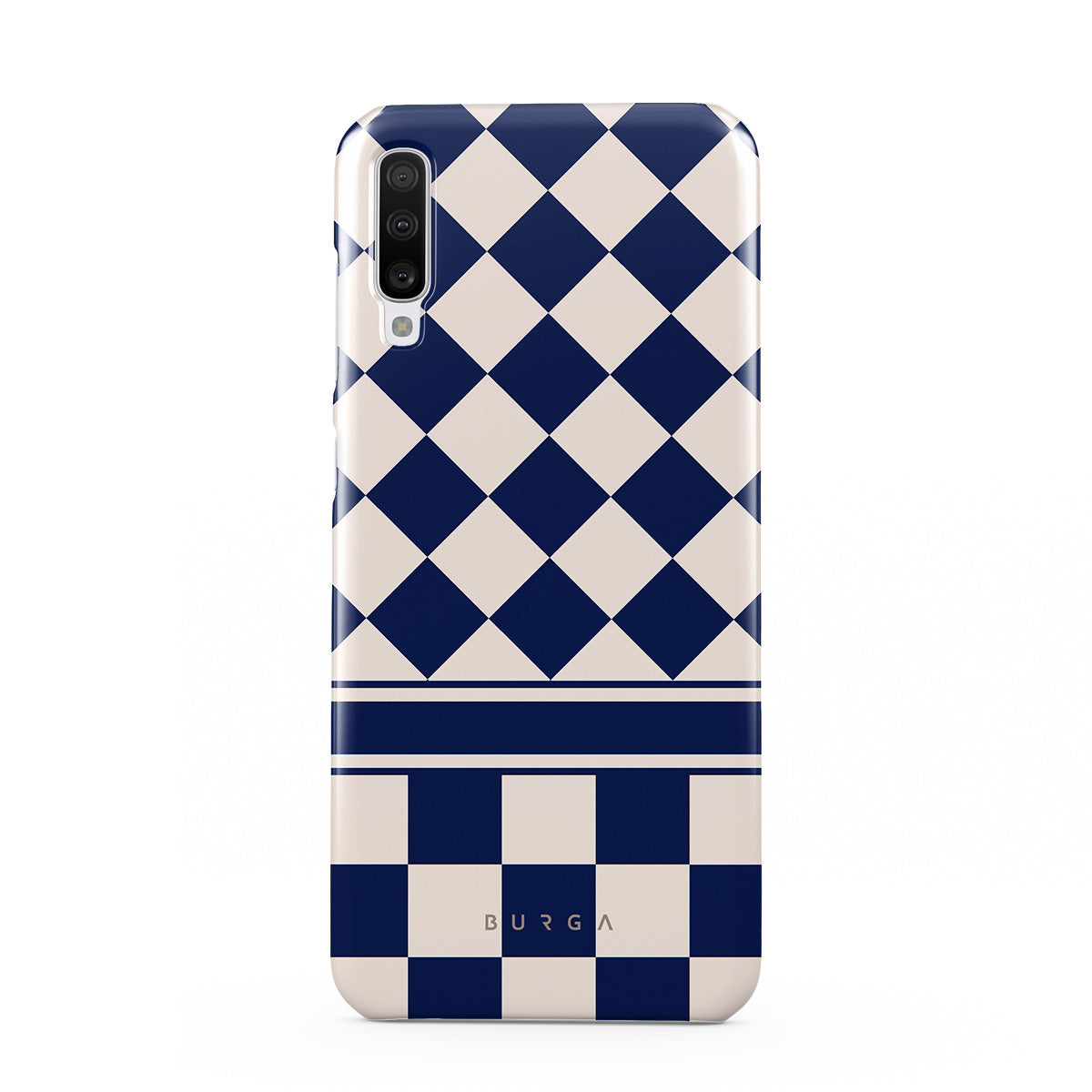 Embrace the essence of subtle luxury with our Check & Mate Samsung Galaxy A70 phone case design. Blending eggshell and deep blue checkers, it evokes whispers of elegance. While diamonds grace the upper half, the lower half features a timeless chessboard pattern.