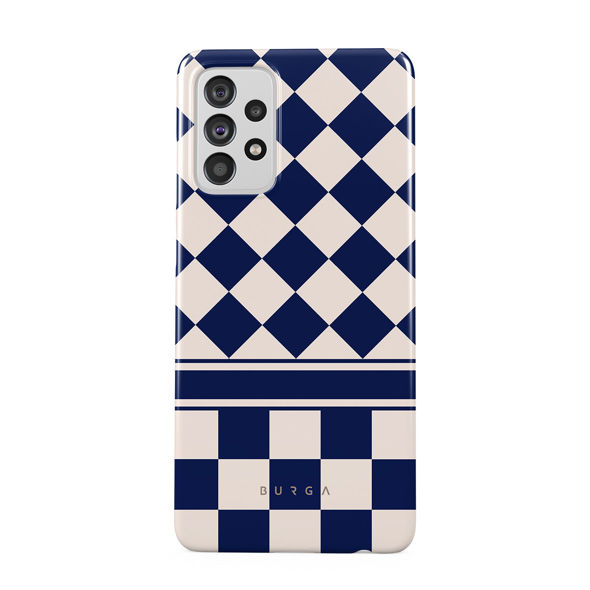 Embrace the essence of subtle luxury with our Check & Mate Samsung Galaxy A72 4G / 5G phone case design. Blending eggshell and deep blue checkers, it evokes whispers of elegance. While diamonds grace the upper half, the lower half features a timeless chessboard pattern.