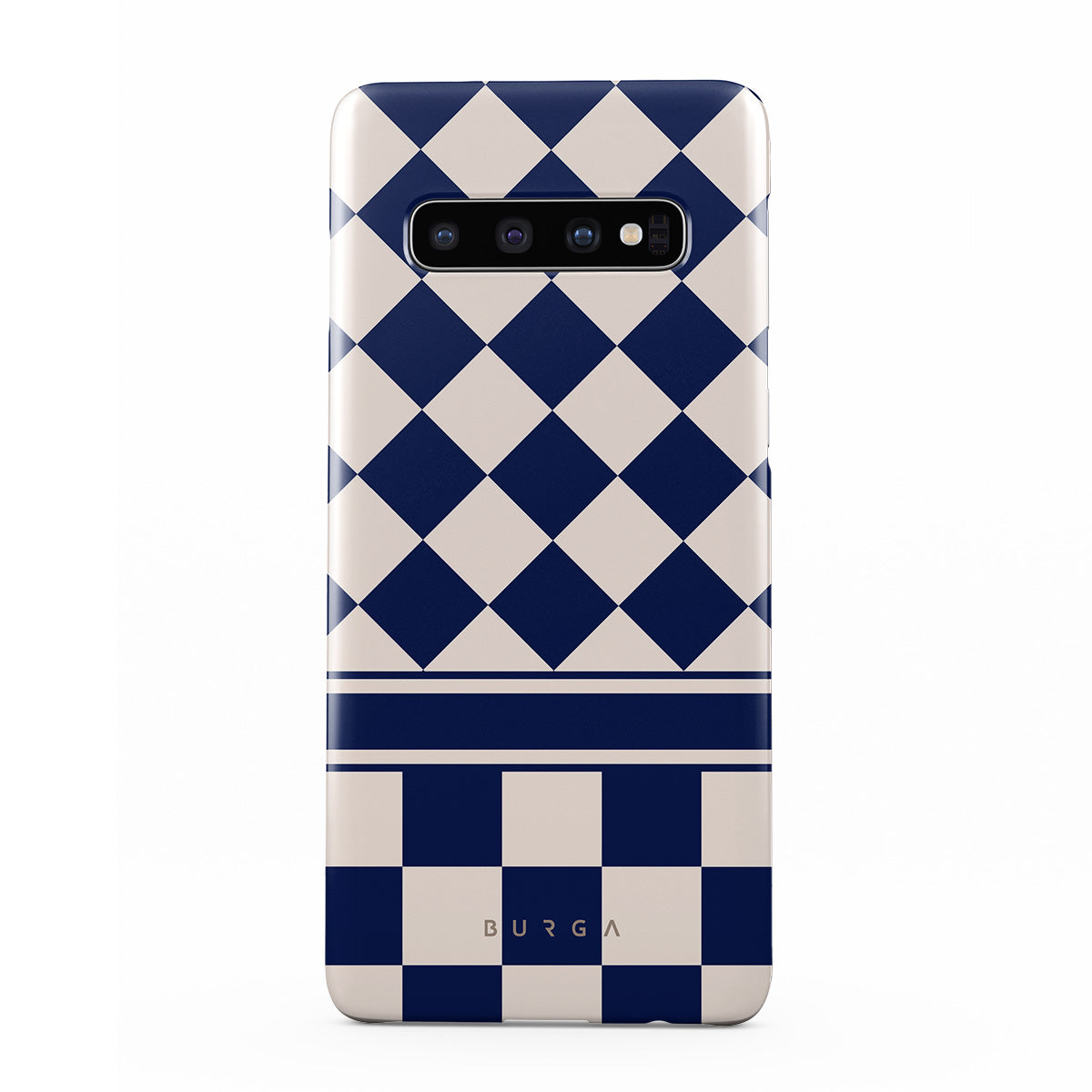 Embrace the essence of subtle luxury with our Check & Mate Samsung Galaxy S10 Plus phone case design. Blending eggshell and deep blue checkers, it evokes whispers of elegance. While diamonds grace the upper half, the lower half features a timeless chessboard pattern.