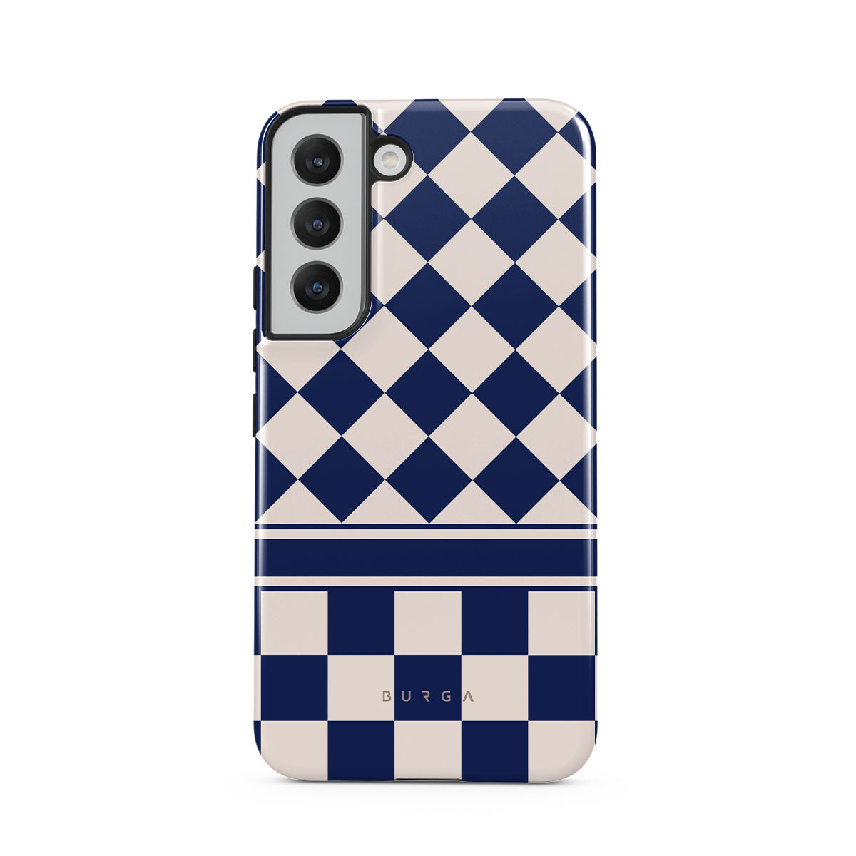 Embrace the essence of subtle luxury with our Check & Mate Samsung Galaxy S22 phone case design. Blending eggshell and deep blue checkers, it evokes whispers of elegance. While diamonds grace the upper half, the lower half features a timeless chessboard pattern.