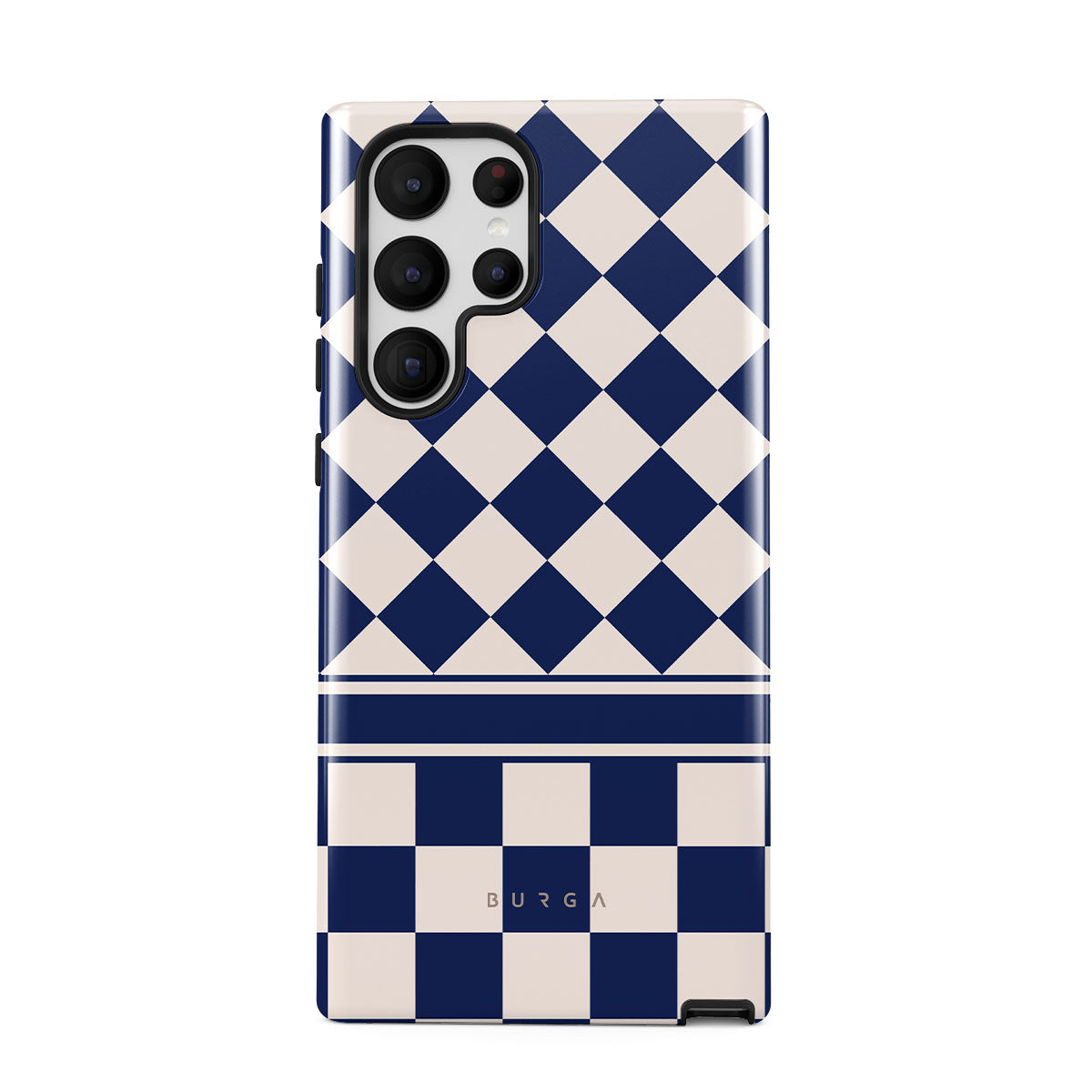 Embrace the essence of subtle luxury with our Check & Mate Samsung Galaxy S22 Ultra phone case design. Blending eggshell and deep blue checkers, it evokes whispers of elegance. While diamonds grace the upper half, the lower half features a timeless chessboard pattern.