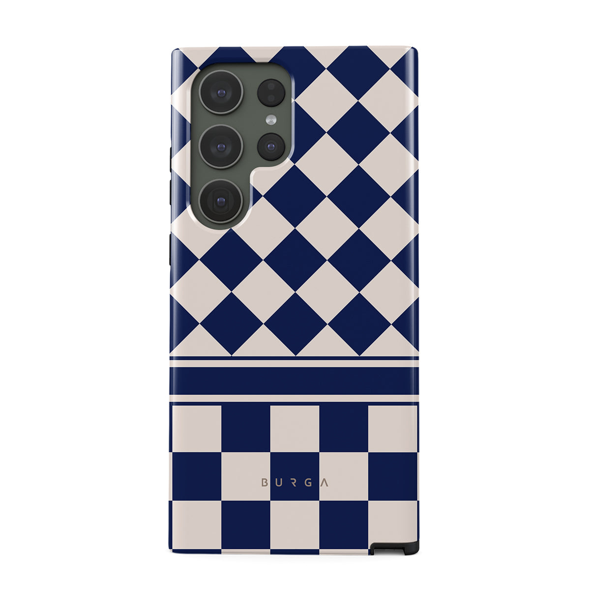 Embrace the essence of subtle luxury with our Check & Mate Samsung Galaxy S23 Ultra phone case design. Blending eggshell and deep blue checkers, it evokes whispers of elegance. While diamonds grace the upper half, the lower half features a timeless chessboard pattern.