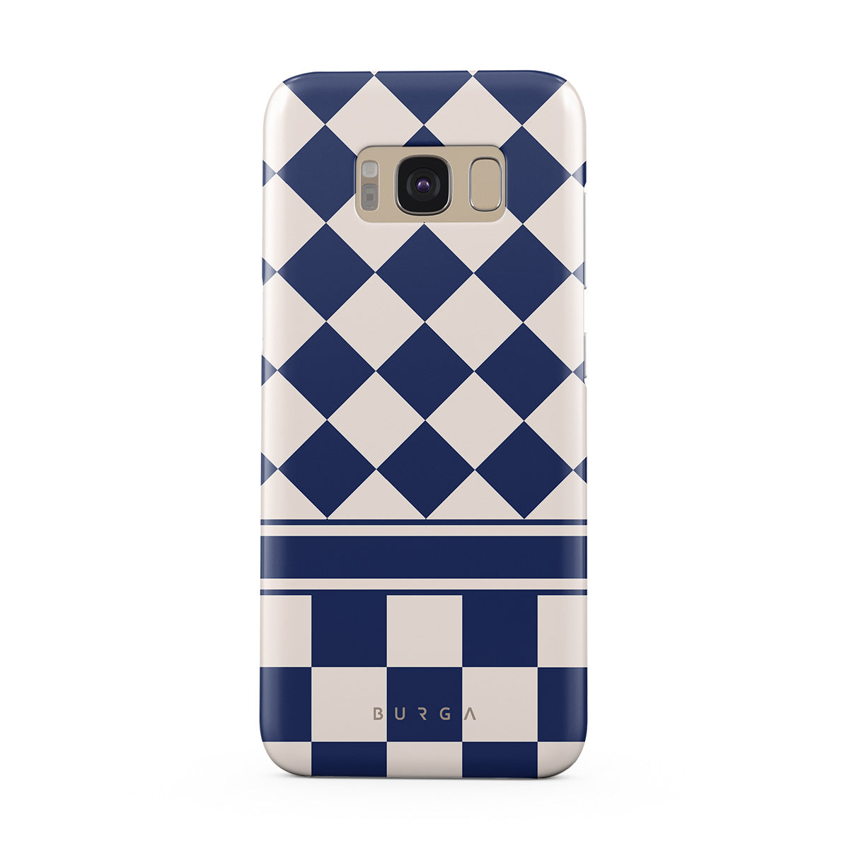 Embrace the essence of subtle luxury with our Check & Mate Samsung Galaxy S8 phone case design. Blending eggshell and deep blue checkers, it evokes whispers of elegance. While diamonds grace the upper half, the lower half features a timeless chessboard pattern.