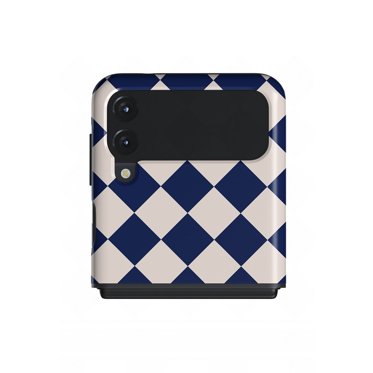 Embrace the essence of subtle luxury with our Check & Mate Samsung Galaxy Z Flip 3 phone case design. Blending eggshell and deep blue checkers, it evokes whispers of elegance. While diamonds grace the upper half, the lower half features a timeless chessboard pattern.