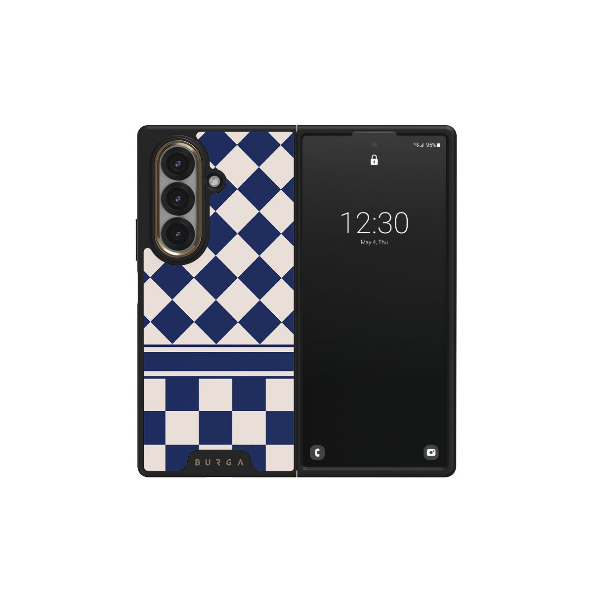 Embrace the essence of subtle luxury with our Check & Mate Samsung Galaxy Z Fold 7 phone case design. Blending eggshell and deep blue checkers, it evokes whispers of elegance. While diamonds grace the upper half, the lower half features a timeless chessboard pattern.